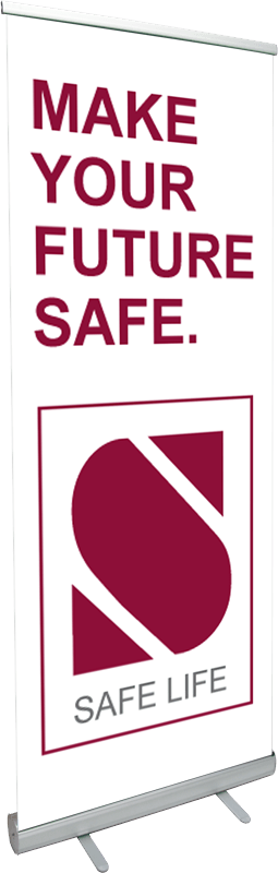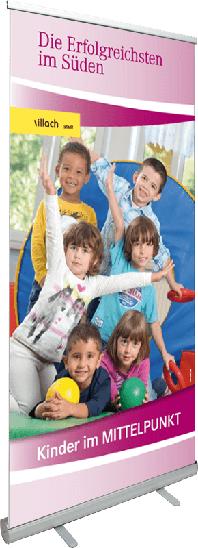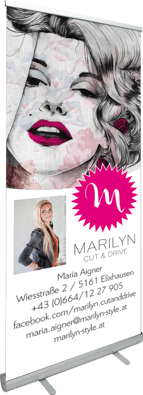 The roll-up for small budgets, simple but nevertheless very stable system made of light aluminum profile, all plastic parts in black, even the side covers are made of black plastic.
